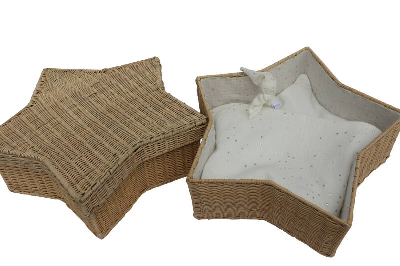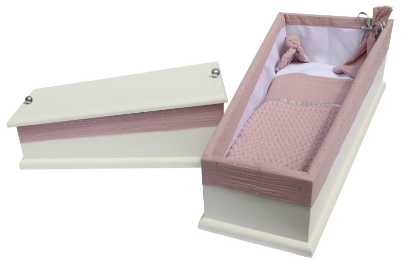 Houten kistjes zijn traditioneel van vorm met een trendy uitstraling. Ze zijn voorzien van een binnenrand, matras en deken. Een bijpassend poppetje wordt meegeleverd, deze is gemaakt van het materiaal waarmee het kistje is bekleed.