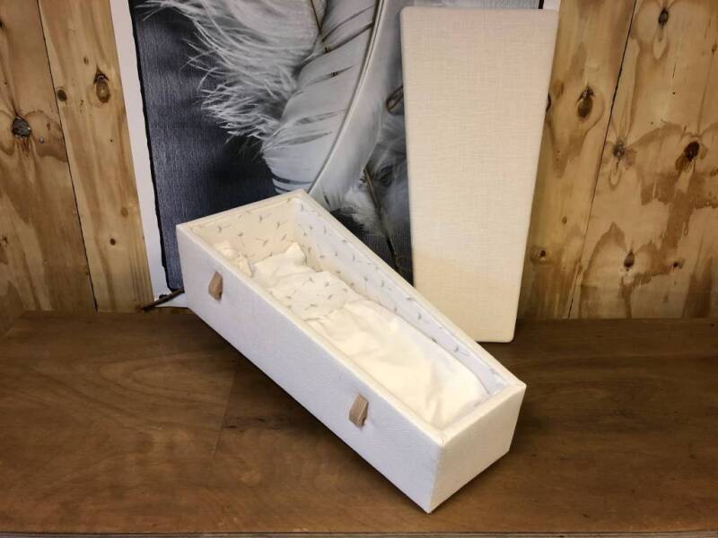De afscheidsbox heeft een zacht matrasje, dekentje, bijpassend poppetje en een kaarsje. Er kan, voor de watermethode, een los plastic bakje bijbesteld worden.